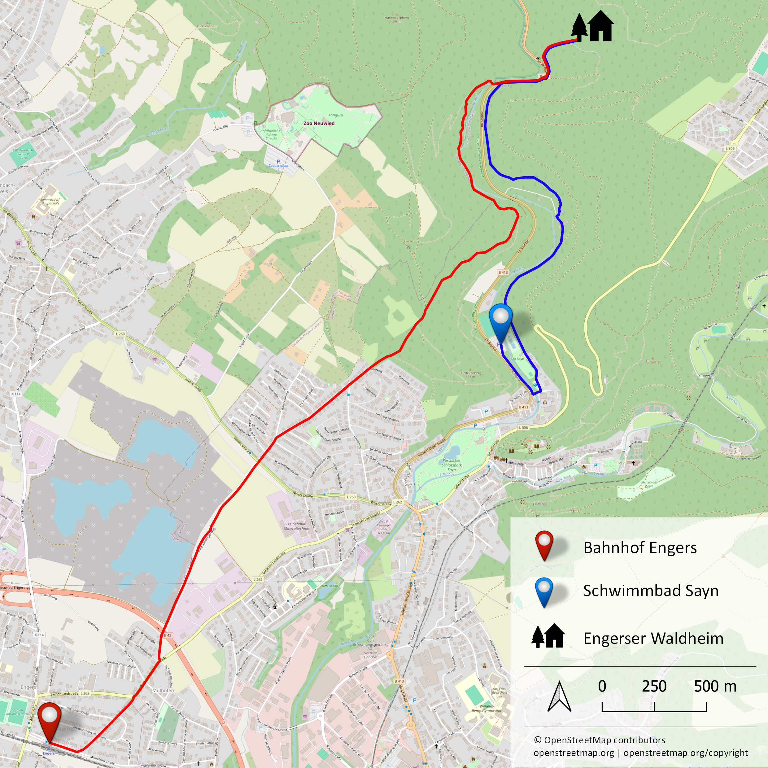 Die rote Stecke verläuft von Engers über den Friedrichsberg in Sayn innerhalb von ca 5,3km zu uns.